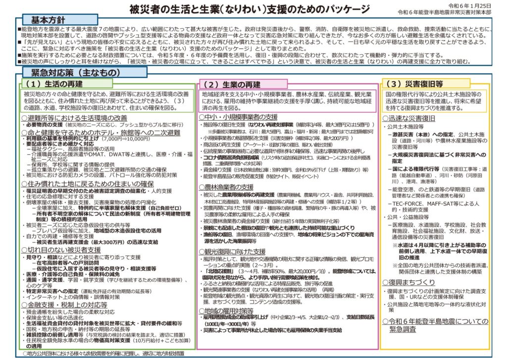 政府は1月2日に「令和6年能登半島地震被災者生活・生業再建支援チーム」を設置し、1月25日には「被災者の生活と生業支援のためのパッケージ」を策定しました。
